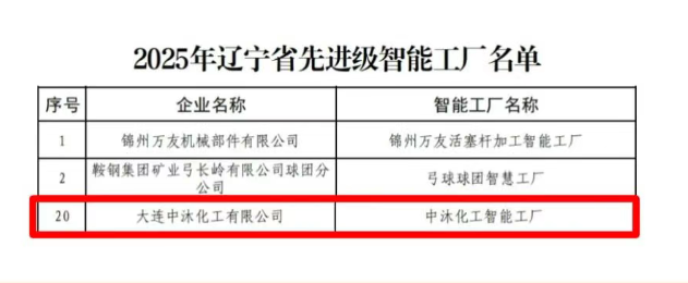 近日,省工信廳網站發(fā)布“2025年遼寧省數字化車間、先進級智能工廠”擬定名單公示,大連中沐化工有限公司中沐化工智能工廠位列其中,擬獲得省先進級智能工廠認定
